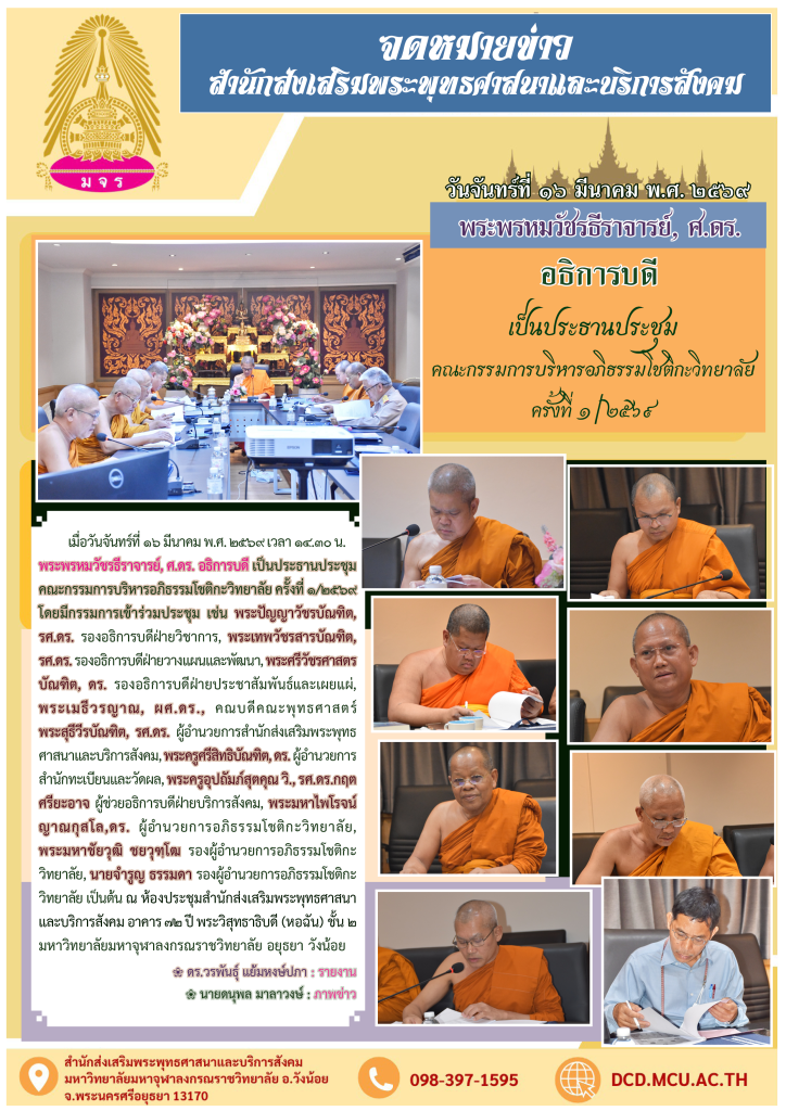 วันพุธที่ ๒๐ สิงหาคม พ.ศ. ๒๕๖๘ เวลา ๑๓.๐๐ น. ประชุมคณะกรรมการบริหารเว็บไซต์ สำนักส่งเสริมพระพุทธศาสนาและบริการสังคม ครั้งที่ ๒/๒๕๖๘ ณ ห้องประชุมสำนักส่งเสริมพระพุทธศาสนาและบริการสังคม อาคาร ๗๒ ปี พระวิสุทธาธิบดี (อาคารหอฉัน) ชั้น ๒ มหาวิทยาลัยมหาจุฬาลงกรณราชวิทยาลัย อำเภอวังน้อย จังหวัดพระนครศรีอยุธยา